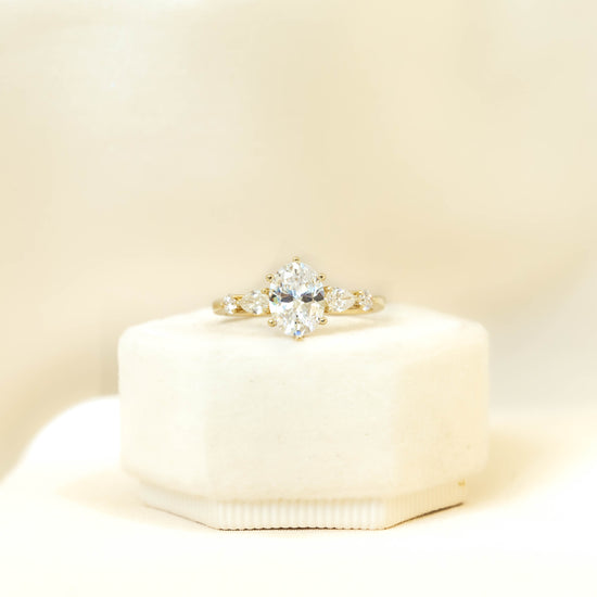 We set .25ctw of pear shaped diamonds along the shank of this 8x6mm oval stone in 14kt yellow gold.